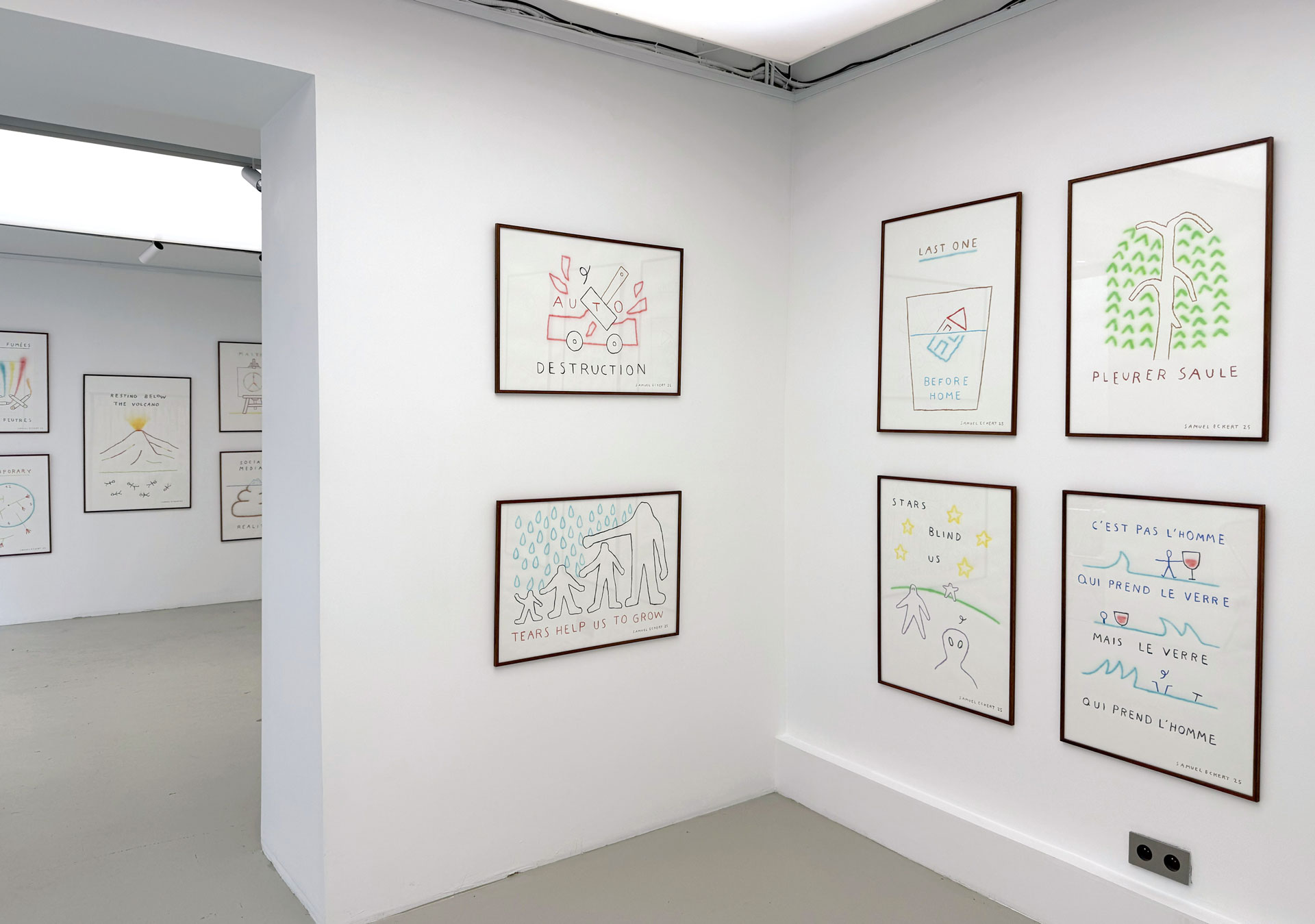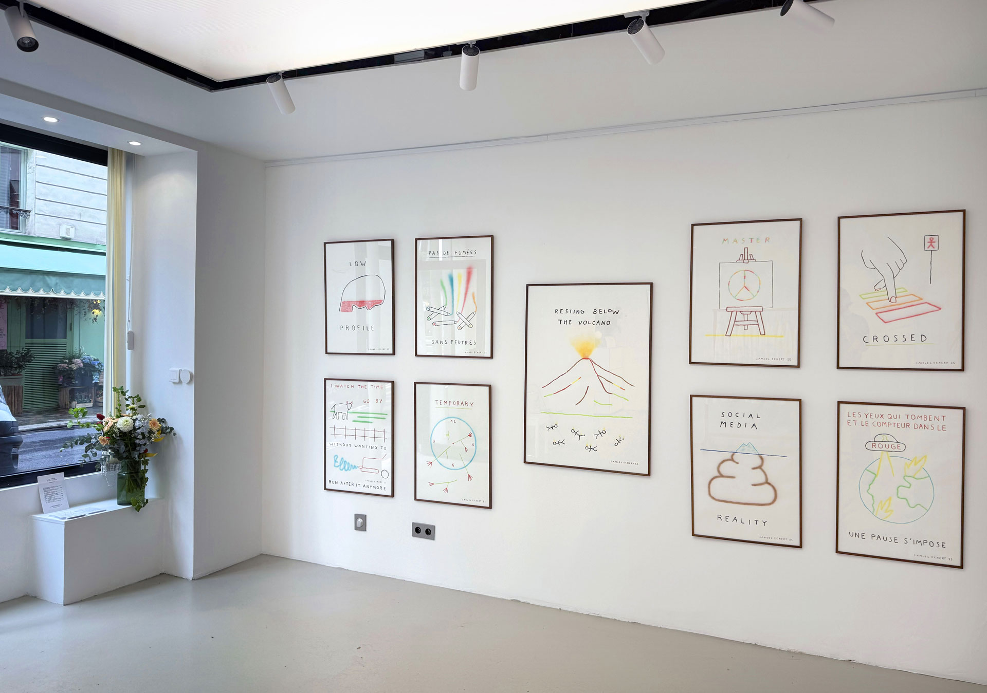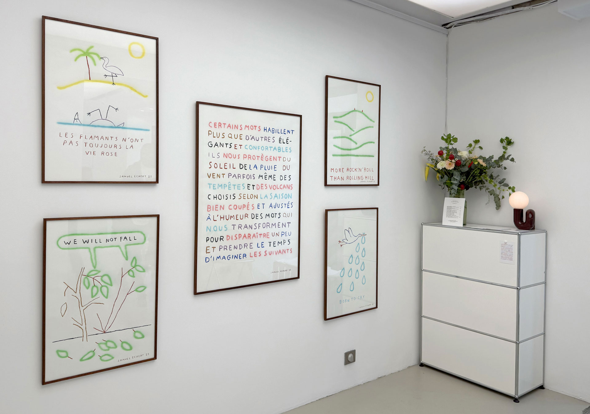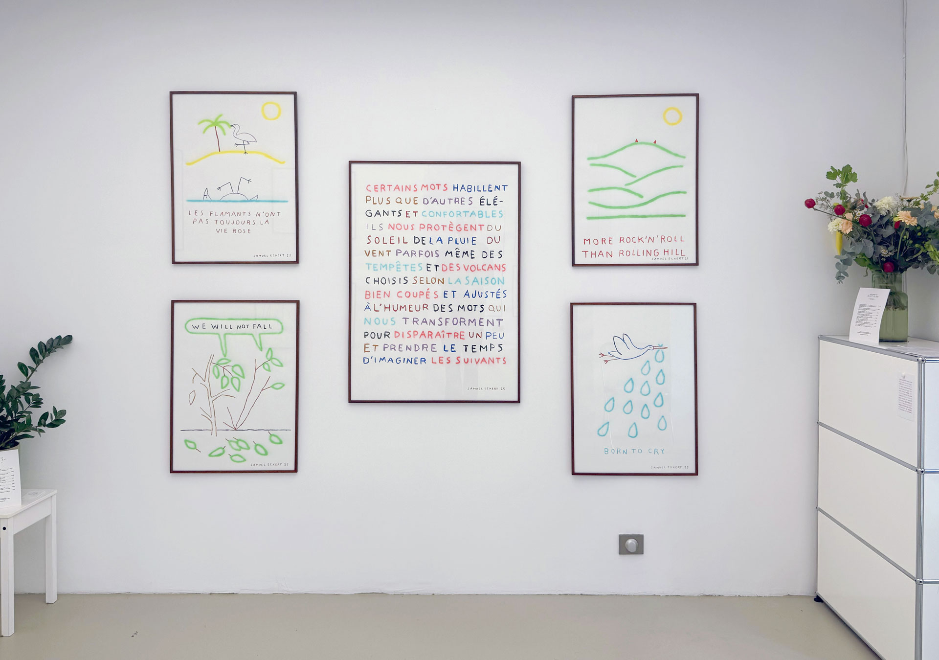 This exhibition brings together around twenty large-format original drawings created with oil pastels and airbrush. Each piece unfolds from everyday thoughts — in French or English, tender or slightly bitter — about passing time, pink flamingos, or the clichés we live with.