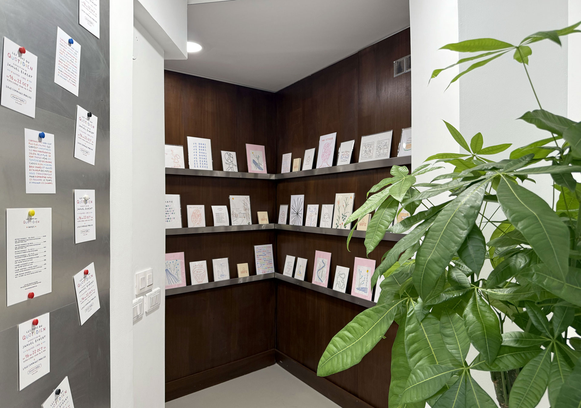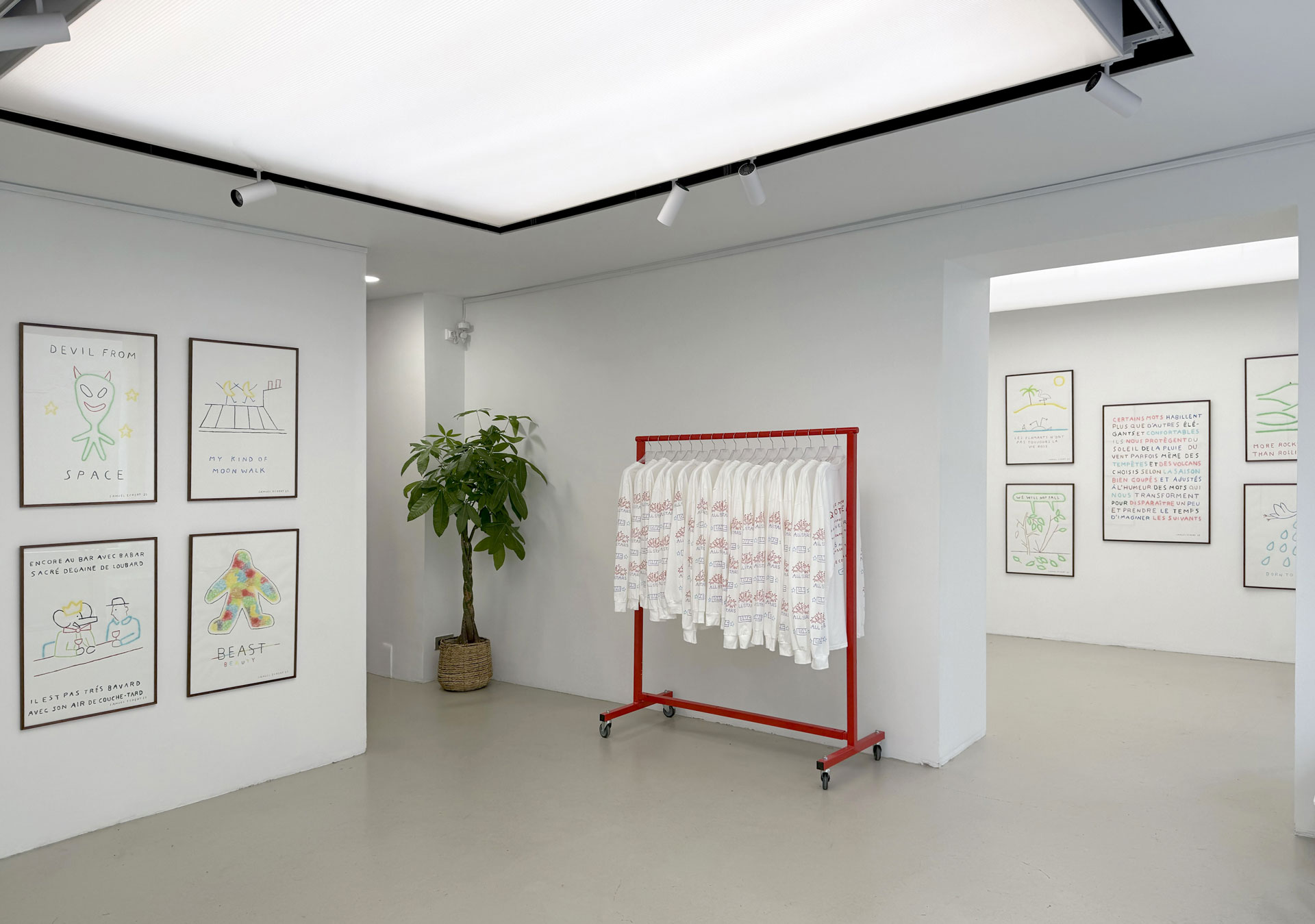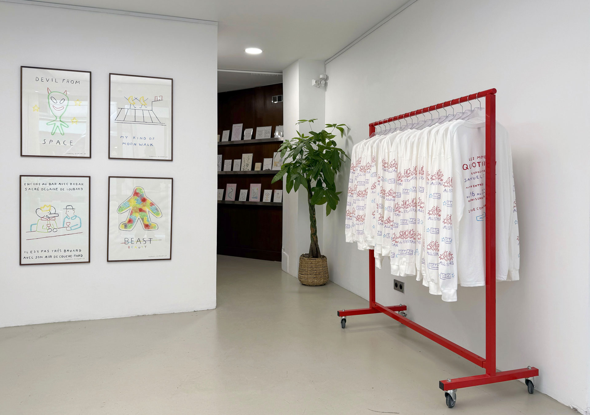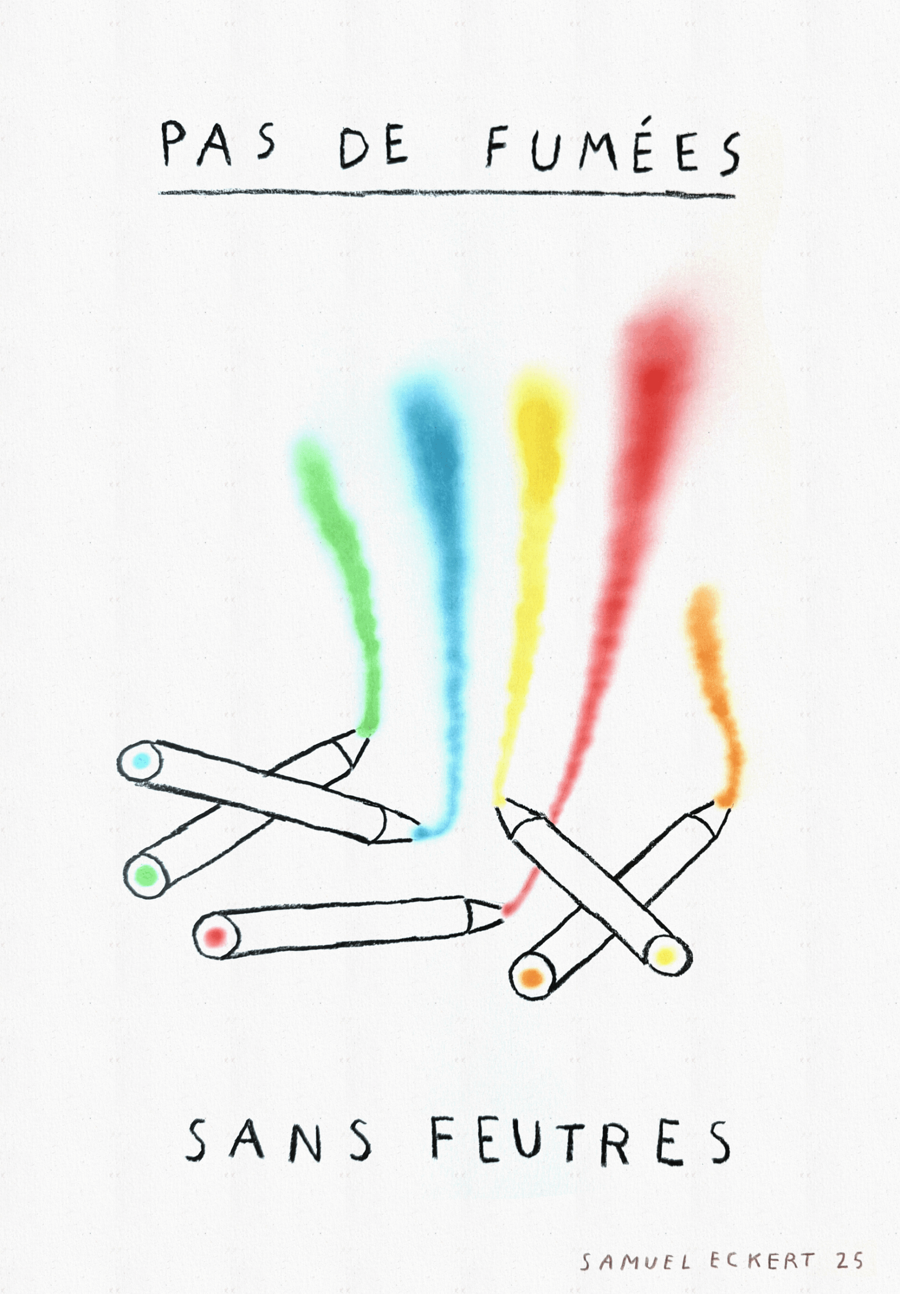 This exhibition brings together around twenty large-format original drawings created with oil pastels and airbrush. Each piece unfolds from everyday thoughts — in French or English, tender or slightly bitter — about passing time, pink flamingos, or the clichés we live with.